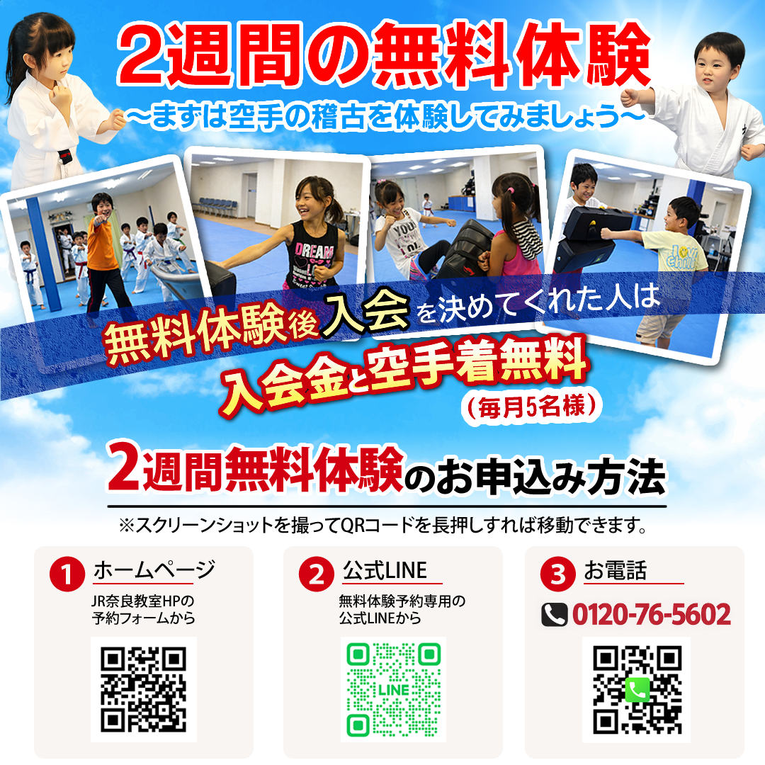 ※2週間の無料体験後に入会を決められた方は「入会金」「空手着」が無料です!(毎月5名様限り)